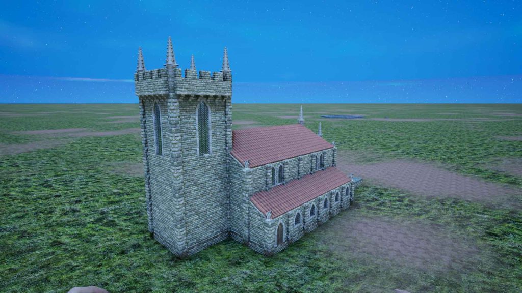 一座以城堡工艺造型为设计的简单教堂,可以不戴皮肤建造,但如果在建造过程中激活了添加皮肤选项,城堡制作皮肤就会被直接应用。